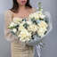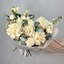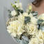 Элегантный букет из белоснежных цветов, дополненный нежными веточками эвкалипта и остролистного озотамнуса. Изысканная композиция создаёт образ чистоты и утончённой гармонии, словно первый снег в зимнем саду.