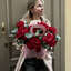 Изысканный букет из бархатных красных французских роз, дополненный серебристо‑зелёными листьями эвкалипта. Композиция размещена в нежной розовой крафтовой сумочке, что придаёт ей утончённый, подарочный вид. Идеальный выбор для выражения глубоких чувств.
