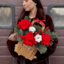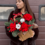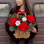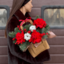 - Композиция №145 в крафтовой сумочке из красных роз, нобилиса, илекса и хлопка