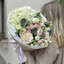 Элегантный букет в пастельных тонах объединяет изысканные текстуры и формы: белоснежная гортензия создаёт пышный объём и мягкую основу композиции, кремовые гвоздики добавляют благородный акцент и утончённую фактуру, белоснежные эустомы привносят воздушность и лёгкость, а веточки эвкалипта и фисташки завершают образ свежей серебристо‑зелёной палитрой. Сочетание чистых оттенков и разноплановой зелени формирует гармоничную, воздушную композицию — идеальный выбор для выражения искренних чувств или элегантного поздравления.
