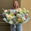 - Авторский букет №156 из роз, гортензий, сантини, гвоздик и лизиантуса